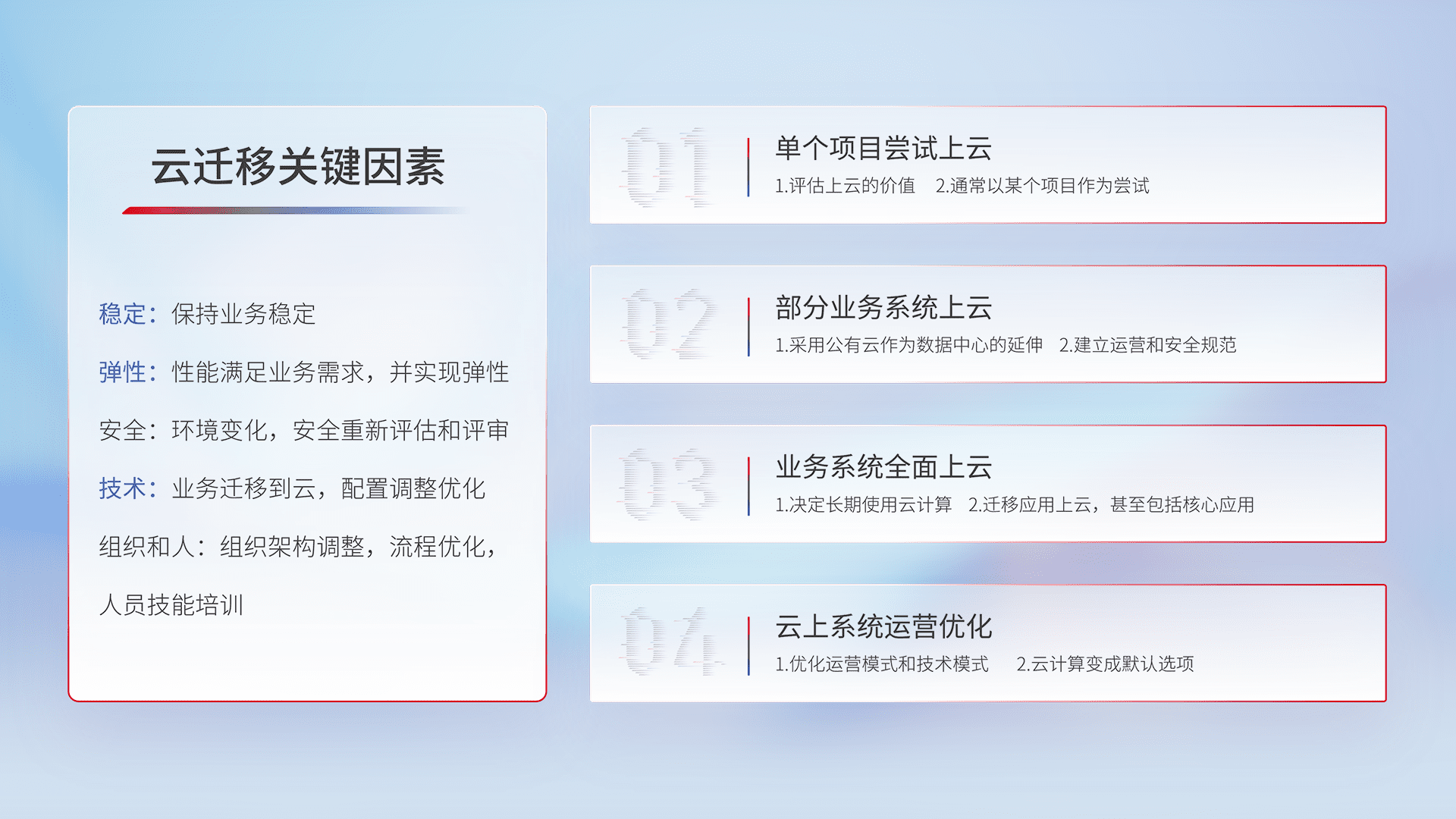 结合实际业务,,从规划设计、、云平台选型、、、云原生改造、、、、数据迁移、、、、集成交付,,,迁移全过程为客户识别最佳上云路径,,做好风险识别管理,,,设计网络架构、、、、身份权限、、安全审计合规、、、、操作审计、、、、日志审计、、监控告警策略、、、、多站点容灾设计等,,,,对云上基础设施进行整体规划,,,提升IT治理水平,,以满足弹性、、、高可用、、、高性能的需求。。。。